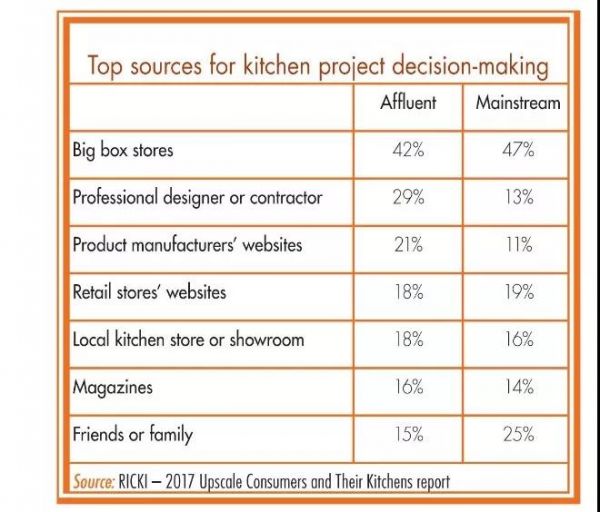 一项针对1000名美国房主的调查发现,一半的人在最近的一个项目中使用了厨房设计师,其中一人在一家居装修店工作,如Lowe's或Home Depot。调查显示,近十分之七的房主购买厨房产品依靠设计师推荐产品,一半用于色彩搭配和完成设计的建议。