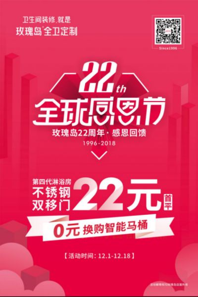 为回馈广大消费者的厚爱,12月1日-18日玫瑰岛22 周年全球感恩节,玫瑰岛匠心推出第四代淋浴房首平方22元,智能马桶0元换购等超值活动回馈广大消费者的厚爱。