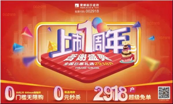 2、上市周年庆期间,2019新品抢先选购。购买蒙娜丽莎瓷砖新品满额则可领取红包2918元,蒙娜丽莎瓷砖股票代码002918,感恩回馈!! (详情到店面咨询)