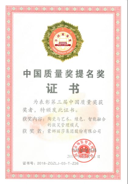 早在2017年12月22日,第三届中国质量奖评选表彰委员会秘书处就公示了第三届中国质量奖及提名奖建议名单,其中9个组织及1名个人获得第三届中国质量奖,80个组织及9名个人获得第三届中国质量奖提名奖,蒙娜丽莎集团榜上有名,位列80个组织第33名,与杨子江药业、中铁工程、中车长春、青岛啤酒等企业共同荣获第三届中国质量奖提名奖。