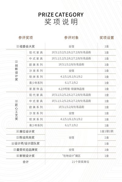 2019金羿奖基于名家具展展览平台,全面考量全馆展览内容,针对各细分领域设置8大奖项21个获奖席位,通过更加优化的奖项结构和精简的奖项数量,提高金羿奖的含量。