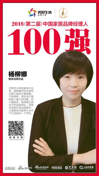 2018年12月12日,在北京举行的”致敬改革开放·致远美好生活——2018中国地产新时代盛典”现场,“2018年(第二届)中国家居品牌经理人评选”结果揭晓。,橙家品牌总监杨柳娜 荣获“2018中国家居品牌经理人100强”。