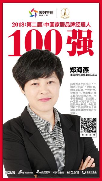 2018年12月12日,在北京举行的“致敬改革开放·致远美好生活——2018中国地产新时代盛典”现场,“2018年(第二届)中国家居品牌经理人评选”结果揭晓。土猫网电商事业部CEO郑海燕荣获“2018中国家居品牌经理人100强”。