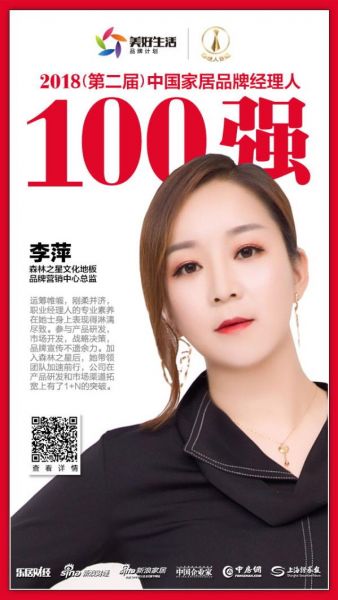2018年12月12日,在北京举行的“致敬改革开放·致远美好生活——2018中国地产新时代盛典”现场,“2018年(第二届)中国家居品牌经理人评选”结果揭晓。森林之星文化地板李萍荣获“2018中国家居品牌经理人100强”。