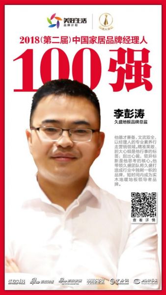 2018年12月12日,在北京举行的“致敬改革开放·致远美好生活——2018中国地产新时代盛典”现场,“2018年(第二届)中国家居品牌经理人评选”结果揭晓。久盛地板李彭涛荣获“2018中国家居品牌经理人100强”。