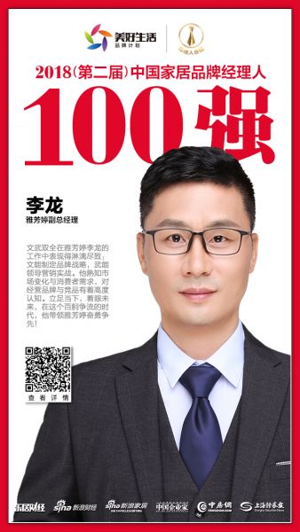 2018年12月12日,在北京举行的”致敬改革开放·致远美好生活——2018中国地产新时代盛典”现场,“2018年(第二届)中国家居品牌经理人评选”结果揭晓。雅芳婷副总经理李龙荣获“2018中国家居品牌经理人100强”。