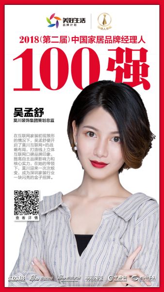 2018年12月12日,在北京举行的”致敬改革开放·致远美好生活——2018中国地产新时代盛典”现场,“2018年(第二届)中国家居品牌经理人评选”结果揭晓。莫川装饰集团策划总监吴孟舒荣获“2018中国家居品牌经理人100强”。