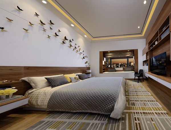 第二,配色选择。通常暖色调是加法,冷色调是减法。基本宽敞的房子用暖色调装修可以充实空间,而小户型则用冷色调,可以在视觉上扩大空间。欧派家居的原木物语系列的卧室的布置,配饰方面色彩略为鲜艳,增加活力,使得整体风格摆脱单调。而金属蝴蝶的装饰,也完美点缀了床头风光。