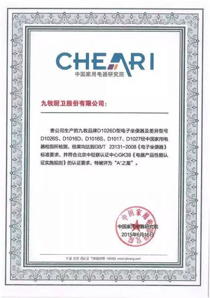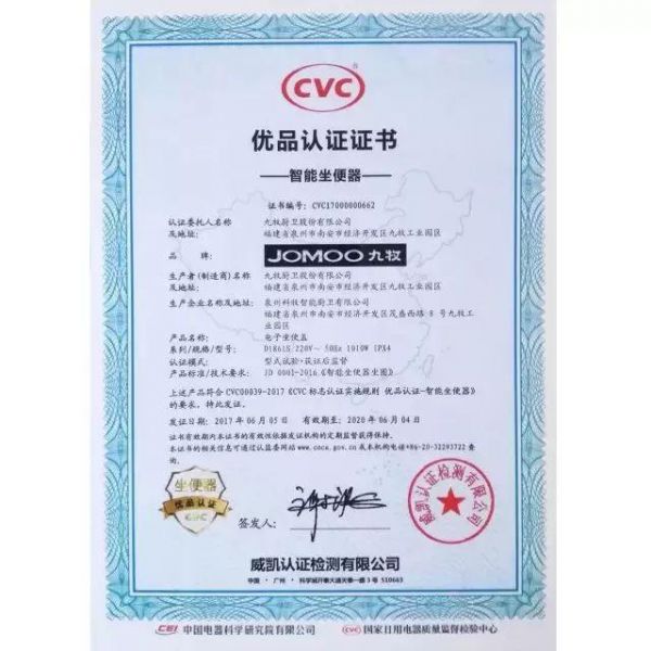 2017年6月,九牧D1861S智能盖板和D6025T智能一体机凭借出色表现,通过CVC威凯检测认证,成为首批“优品认证”产品。