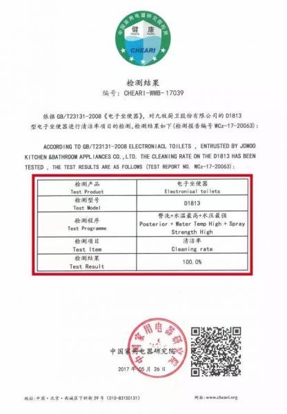 2017年7月,九牧智能马桶“秒杀”1000款国内外主流品牌的智能马桶,成为行业内唯一通过100%清洁率检测的品牌。