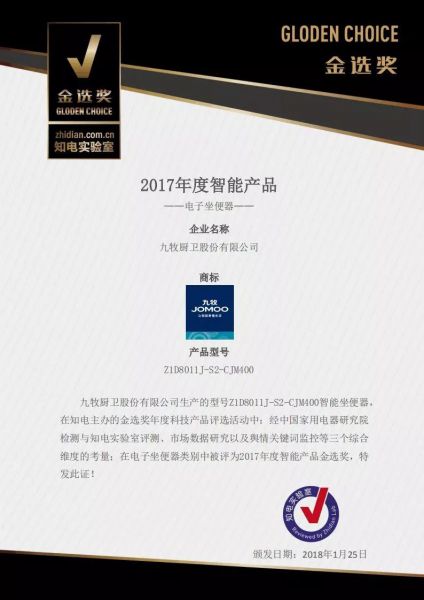 2018年1月,九牧Z1D8011J电子坐便器荣获2017年度智能产品金选奖。