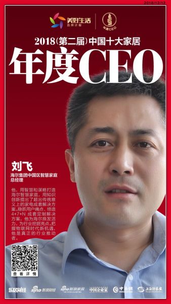 2018年12月12日,在北京举行的”致敬改革开放 致远美好生活——2018中国地产新时代盛典”现场,“2018年(第二届)中国家居经理人评选”结果揭晓。海尔集团中国区智慧家庭总经理刘飞荣获“2018中国十大家居年度CEO”。