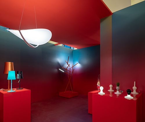这次米兰国际家具(上海)展,就可以看到 Ferruccio为众多品牌设计的产品,同时他还为多个品牌设计了展览空间。Foscarini的展位设计即由他操刀,以品牌色红色为主基调,融入50多个产品的颜色,塑造出渐变的色彩效果,以此传递品牌的多样性。