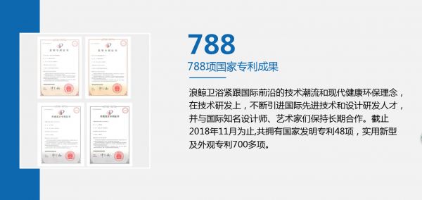中国专利奖评选至今已举办二十届,浪鲸卫浴从2015年起连续四年获得“中国专利奖·中国外观优秀设计奖”,产品“鲸鱼缸”、“玛格丽特系列浴室柜”、“风漪系列浴室柜”和“花恋系列龙头”等多款产品先后荣登设计舞台,赢得评审团的持续好评,创新设计能力再次获得肯定。