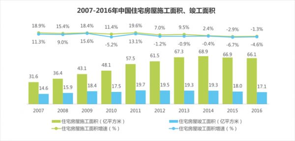 2016年中国住宅房屋施工面积高达66.1亿平方米,住宅房屋竣工面积17.1亿平方米。