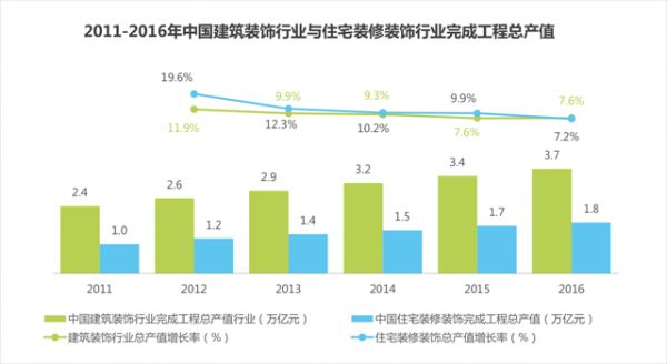 2016年中国建筑装饰行业与住宅装修装饰行业完成工程总产值3.7万亿元,其中住宅装饰完成工程总产值1.8万亿元。