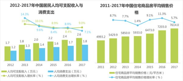 2017年中国居民人均可支配收入2.6万元,人均消费支出1.8万元;2017年住宅商品房平均销售价格7614.0元/平方米。