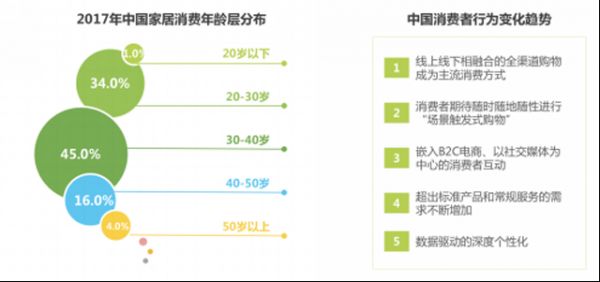 随着80.90后逐步进入适婚年龄,伴随着互联网成长起来的新一代成为了买房装修的主力军,调查报告显示,2017年中国家居消费年龄层分布:30-40岁的80后,占比45%;20-30岁的90后,占比34%。也就是说,2017年中国家居消费群体中,20-40岁80后、90后是家居消费的主力军,占比高达79%。