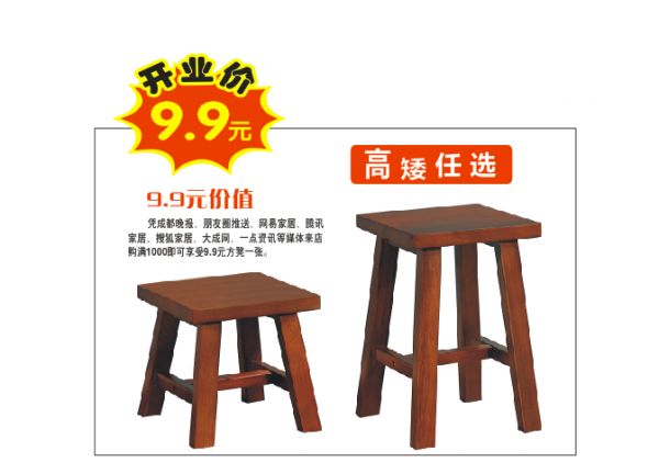 凭开业各大媒体推广信息来店购满1000元,即可享受9.9元方凳一张;