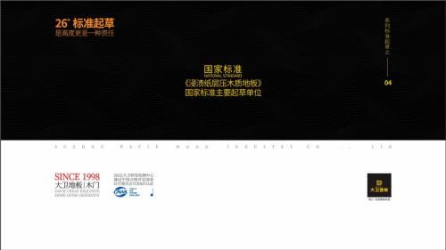 标准对一个行业乃至国家在规范质量水平、引导技术发展上有着举足轻重的地位。作为全国人造板标准化技术委员会单位委员、林业产业标准化国家创新联盟发起单位,大卫地板凭借着在品质管控体系和企业标准体系建设等方面的出色表现,始终致力于为行业标准化、制度化建设贡献力量,是1项国际标准、8项国家标准、13项行业标准以及4项团体标准主要起草单位:包括国际标准《实木地板通用要求》ISO 17959: 2014;国家标准《实木复合地板》GB/T 18103-2013、《高耐磨地板》GB/T 31745-2015、《地采暖用实木地板技术要求》GB/T 35917-2018、《木质地板铺装、验收使用规范》 GB/T 20238-2018、《实木地板 第1部分:技术要求》GB/T 15036.1-2018、《实木地板 第2部分:检验方法》GB/T 15036.2-2018、《浸渍纸饰面实木复合地板》、《浸渍纸层压木质地板》;行业标准《直接印刷木质地板》、《仿古木质地板》LY/T 1859-2009、《实木集成地板》LY/T1614-2011、《木质门安装验收规范》LY/T 2387-2014、《地采暖用木质地板》、《艺术拼花地板》、《实木复合地板用胶合板》、《木质集成家居安装、验收和使用规范》、《木质集成家居部件制造通用技术要求》、《人造板及其制品甲醛释放量分级》、《人造板及其制品气味评价方法》、《室内木质隔声门》、《木质移动门》;团体标准《无醛添加地板》 T/CTWPDA04-2018、《地采暖用实木地板坯板》 T/WJDB 001-2018、《地采暖用实木踢脚线》T/WJDB 002-2018、《地采暖用实木地板铺装、验收及使用规范》T/WJDB 003-2018主要起草单位。大卫地板由始致终高标准的自我要求,与稳扎稳打的品牌发展之路,也成就了大卫在行业中的口碑与形象。