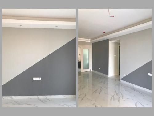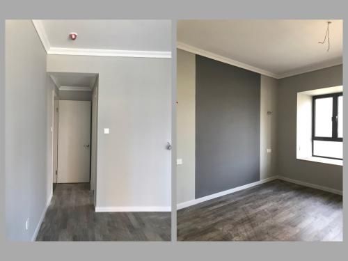 看一下我们家在橙家装修装好的实景图吧,但是还没有买软装,期待到时候软装进场的效果。这个是客餐厅,我们刷了灰色的油漆,电视墙那里增添了一点小趣味,刷了拼色的,设计的整体风格也是比较偏冷色调,是现在很流行的性冷淡风。
