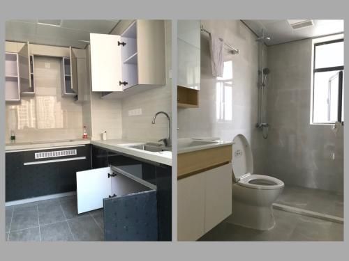 因为整体风格都是灰色调,所以厨房和卫生间也不例外,选的地砖和墙砖也是属于灰色调的,最喜欢的是橙家的橱柜,是亮面的板材,然后颜色也很丰富,简单但是很好看,主要还是收纳空间很足够,橱柜还是不限长度,我们做了L字型橱柜,所以空间很足够。