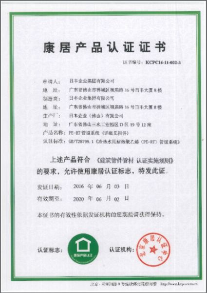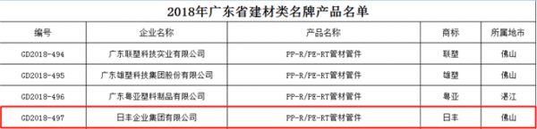 根据《广东省名牌产品评价指南》标准要求,在企业自愿申报的基础上,经申报资料初审、审报数据公示、企业现场审查、专家综合评价、广东质量品牌评审专家委员会审议确认,授予日丰企业集团的“PP-R/PE-RT管材管件”“铝塑复合管”等系列产品为2018年度广东省建材类名牌产品称号,有效期三年。