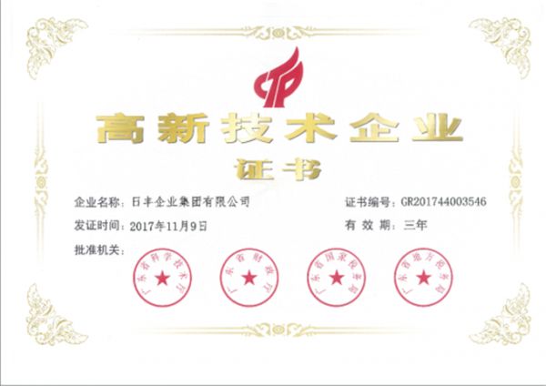 日丰集团是国家技术创新示范企业、国家火炬计划重点高新技术企业、广东省战略性新型产业骨干企业、广东省创新型企业、广东省知识产权优势企业,建有国家级企业技术中心、广东省复合管道系统工程技术研究开发中心、广东省企业重点实验室和新型管道研究院等技术创新平台。