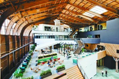 改造后的办公区总面积41806平方米,包含办公室、咖啡厅、健身房,以及一个能容纳250人的集会空间。机库内部大而高的空间导致这些分区距离较远,就通过几条悬空走廊将它们连接起来。