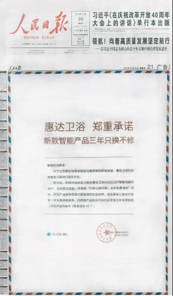 12月20日,惠达卫浴在人民日报上向全国消费者郑重承诺:“惠达卫浴新款智能马桶HDE3105T服务升级——三年以换代修,五年免费保修”。通过人民日报这样的权威媒体发声,不得不让人们惊叹惠达卫浴强大的品质自信,以及满足用户体验至上的匠心追求,这也引发了行业的广泛关注。
