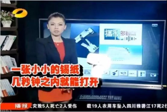 锡纸开锁:将锡纸放在一个特制的工具内,通过另外一样工具辅助插入锁芯。左右摇晃1分钟左右,锁就被打开。