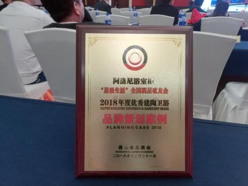 活动同期,对本年度部分优秀陶瓷、卫浴与配套企业进行了表彰。凭借浴室柜行业首创大型明星签售模式及其品牌影响力,“星级生活”阿洛尼浴室柜全国明星歌友会,荣获“2018年度优秀建陶卫浴品牌策划案例”,成为首次且唯一入选该奖项的浴室柜品牌。