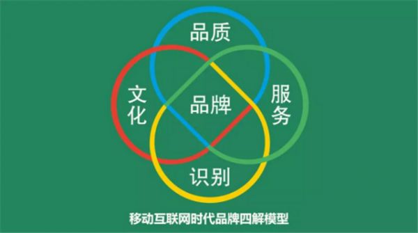 品牌的本质是什么?品牌的本质是唤起用户心中潜在渴望的某种需求,品牌的本质是与用户建立更深层次的沟通,在“思想、心灵和精神”上形成共鸣。因此,在移动互联网时代,新的品牌模型因时代变化而重新构建,移动时代的品牌四解模型由此诞生:品质、服务、识别、文化。