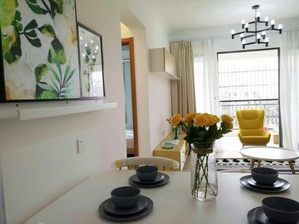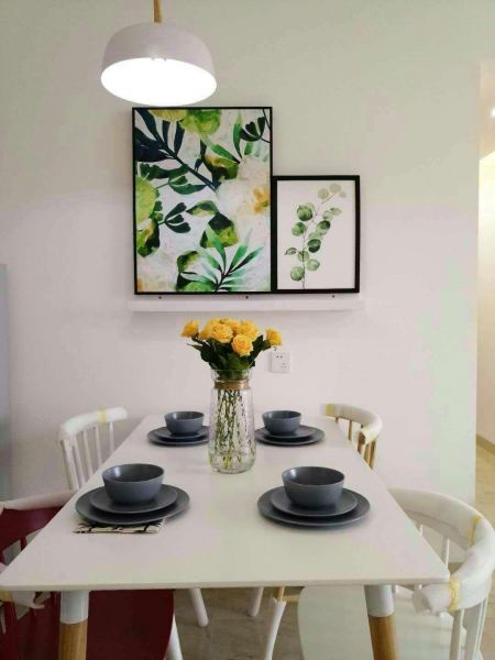 餐厅设计简约中有小心思,墙上的装饰画特别喜欢,很夏天。墙面橙家设计师都没做其他装饰。乳胶漆是大品牌,质量不错,颜色也挺好看,但是一点都不会死白,所以不用做其他装饰都好看。