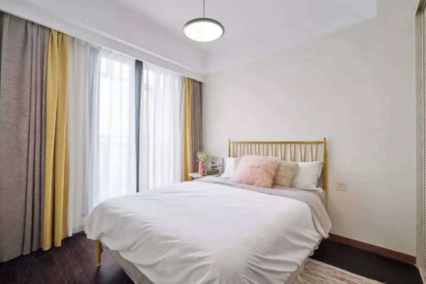 卧室用是比较大方的设计感,橙家设计师建议直接整个房间深邃白,这样整理看起来简约大方。简单的设计,跟客厅呼应,卧室都点缀了黄色元素,眼前一亮。次卧相对色彩比较深一些,是给家里老人准备的。