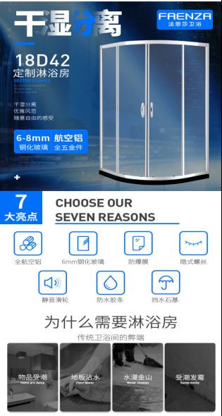 洗个澡,卫浴间就像下雨一样湿淋淋一片,纸巾、衣服、浴室柜也全部跟自己一起洗了个澡。纸巾衣服啥的还好处理,这花了不少钱的浴室柜,如果质量不咋样,早就废了。所以“干湿分离”至关重要。干湿分离,一般有浴帘、淋浴房、全分离三种,浴帘上下漏,效果比较差,且容易滋生细菌;全分离,就是单独只有淋浴功能的空间,一般户型太小不允许,很难做到,并不现实。因此,淋浴房是最实用的,法恩莎淋浴房组装后缝隙小,且采用磁性胶条密封,有效隔绝水汽,贴心防护,尽管上方水汽会有少量泄露,但开好排气扇,做好通风工作,就能很好地解决了。