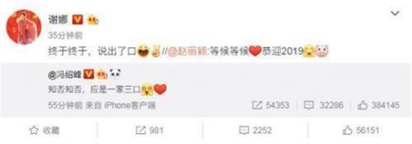 新年伊始,北京时间2019年的1月1日,冯绍峰发文正式宣布赵丽颖怀孕喜讯,更贴合热播中的跨年大剧,写道:“知否知否,应是一家三口”,赵丽颖则以“等候等候 恭迎2019”幸福回应。