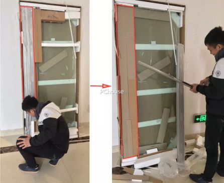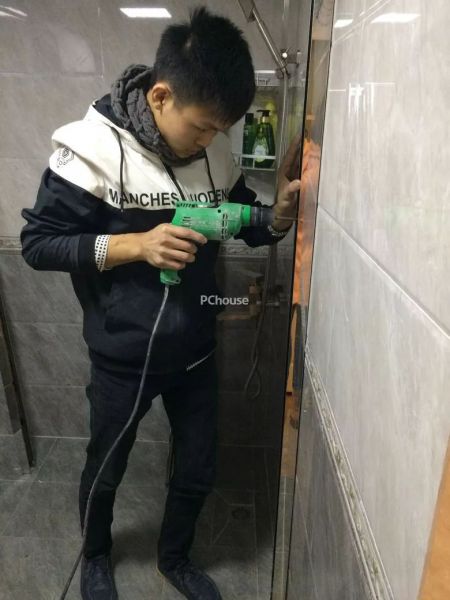 安装过程中,安装人员技术很扎实,认真细致,在和N小姐确认需求后,开始展开工作,在确认预埋的水管走位,防止钻孔损坏水管,然后进行电钻打孔,安装不锈钢边框、小零件、玻璃门、拉手......