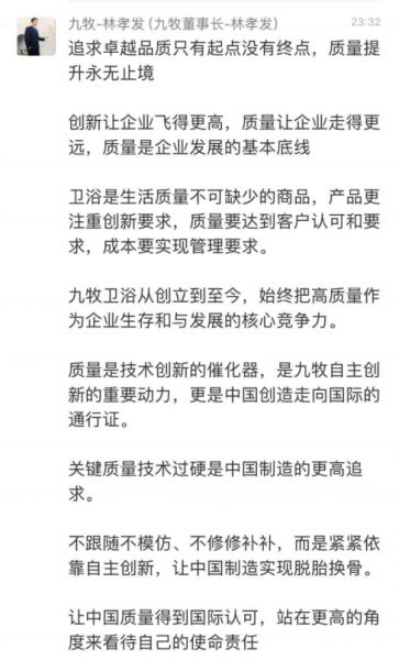 新年伊始,九牧董事长深夜在高管工作群里发出重要指示,强调质量、创新、技术,以更高的角度来看待自己的使命责任。一字一句,都是对质量的重视和坚守。