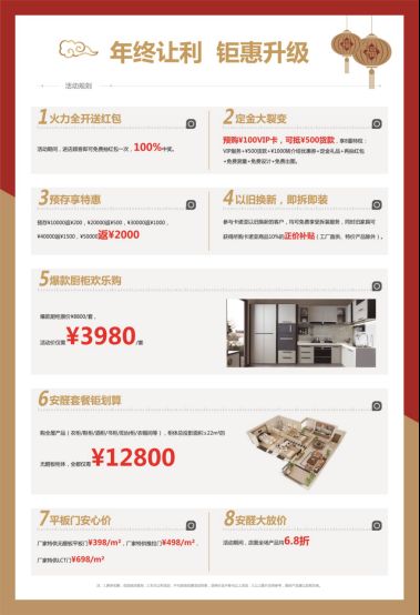 还有最让消费者激动的跨年欢乐送活动,活动期间进店顾客即可免费抽红包一次,100%中奖。其次,预购¥100VIP卡,可抵¥500货款,享8重特权:VIP服务+¥500货款+¥1000转介绍优惠券+定金礼品+再抽红包+免费测量+免费设计+免费出图。再次,预存¥10000返¥200……¥50000返¥2000。最后,活动期间,店面全场产品均6.8折,让每个进店顾客都能满载而归。