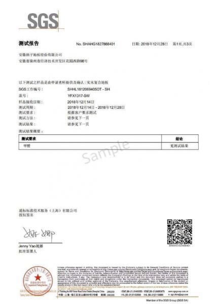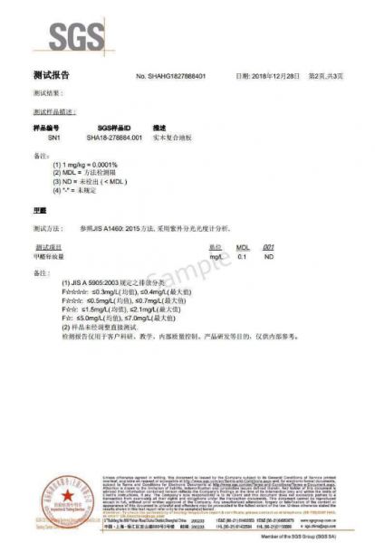 结果显示,扬子负离子无醛制造实木复合地板甲醛释放量“未检出”,原因是SGS甲醛释放量检测最低值为0.1mg/L,少于0.1mg/L的甲醛释放量,可忽略不计,正如我们日常生活中的食品,如梨中含甲醛60mg/kg,猪肉中20mg/kg,生活中喝的水中也含有低量的甲醛,但数值都很低,对人体没有伤害,不在检测范围,扬子负离子无醛制造实木复合地板用检测结果实力证明了真正的绿色环保!
