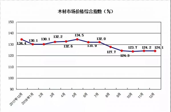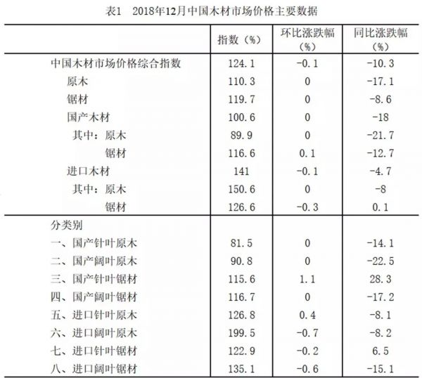 2018年12月,中国木材市场价格综合指数为124.1,环比下滑0.1个百分点,同比下滑10.3个百分点。其中,原木价格环比持平,同比下滑17.1个百分点;锯材价格环比持平,同比下滑8.6个百分点。国产木材价格环比持平,同比下滑18.0个百分点;进口木材价格环比下滑0.1个百分点,同比下滑4.7个百分点。