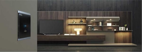 客厅合适位置处只需安装一台嵌墙触摸屏取消其他规格大小不一的灯光、温控面板等使墙面整洁清爽,触摸屏可进行全局灯光、窗帘、空调、地暖、可视对讲等所有设备控制(包括本层其他区域),可预设一键场景模式,如:会客、电视、明亮、全关等。
