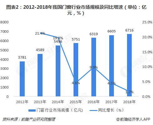 据统计,我国门窗行业市场规模自2012年以来便呈现跳跃式增长,2013年市场规模达到4589亿元,比2012年增长了近800亿元;2014-2016年三年门窗行业市场增速较之前有所下降。2017年门窗行业市场规模达到6605亿元,主要受益于下游房产和建筑产业的市场向好发展。不过,从2018年我国楼市市场发展来看,我国门窗行业发展脚步将会进一步放缓,预测全年规模为6716亿元。