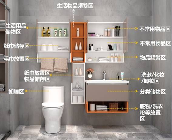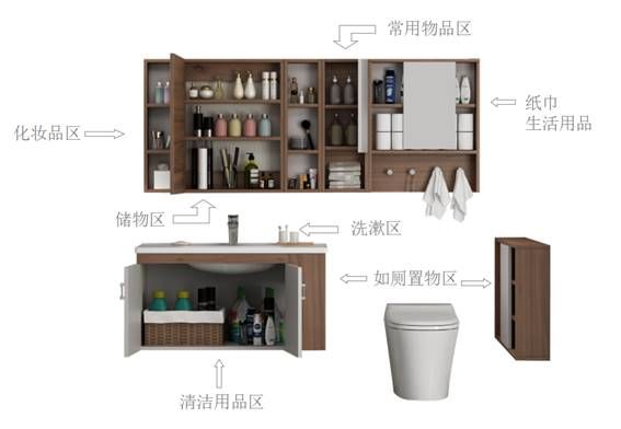 镜柜中可以存放一些不常用的物品,而镜柜下方的开放区域则理所当然的作为洗漱时需要频繁拿取使用的物件存放地。镜柜旁的开放式侧边柜同样是生活物品的频繁区,依据使用频次多少依次为镜柜下方的开放空间——镜柜旁的侧边柜。而马桶上方则需要设置一个封闭式橱柜,作为存储区,一些大件或是储备用品存放在这里。