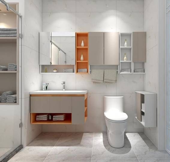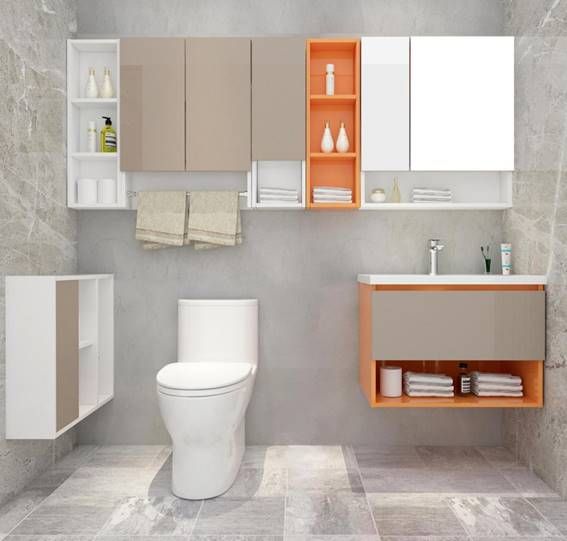 以安华卫浴轻定制·香橙星空为例,洗手台下主柜的敞开式储物,可以放置干毛巾和一些生活小用品,侧边可以放置纸巾和智能马桶遥控器、手机以及杂质等物品。