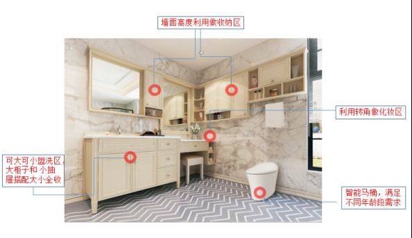 首先不同年龄段的人群对卫浴产品的使用习惯不一样,年轻人追求品质舒适,老人家需要安全方便。其次是一个卫生间收纳空间小,物品存用不便。比如年轻人化妆品护肤品等各种瓶瓶罐罐多,一大半要放在卫生间使用;小孩子各种洗澡用品、玩水的玩具也是零零碎碎一大堆;老人家东西虽少,但是总是希望能与年轻人分开放置比较方便......