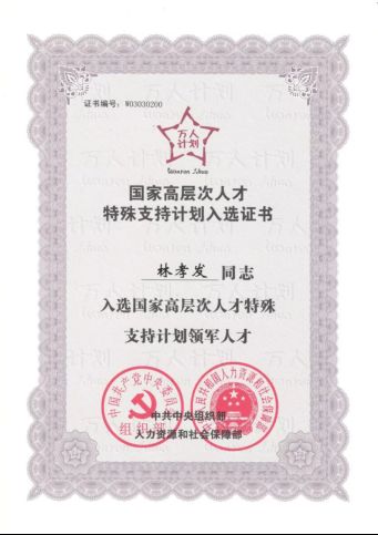 日前,中共中央组织部、国家人力资源与社会保障部正式向九牧董事长林孝发颁发国家高层次人才特殊支持计划入选证书,林孝发入选国家高层次人才特殊支持计划领军人才。