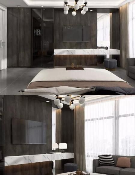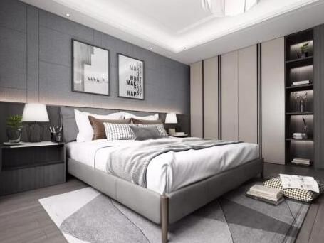 黑色轻奢拉手的运用,卧室的每一处细节都体现出其高雅的品位和不凡的艺术修养,万骊衣柜功能上功能区与展示区的设计,方便使用者的生活起居。柜体同色护墙板的运用更是让整个空间协调整体。