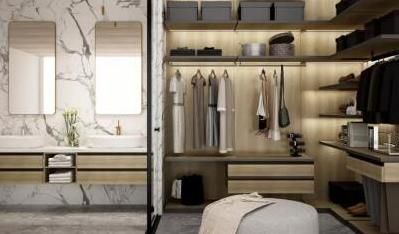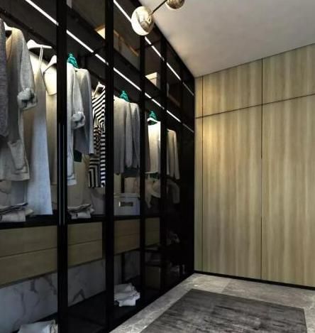 干湿分明是此衣帽的优势,卫浴室+更衣室的设计避免了很多不必要的麻烦。全开放式衣帽间,沐浴后可快速找到需要的衣服,一览无余,相比传统封闭式衣帽间,空间利用上更加充分,功能分区上更加合理。